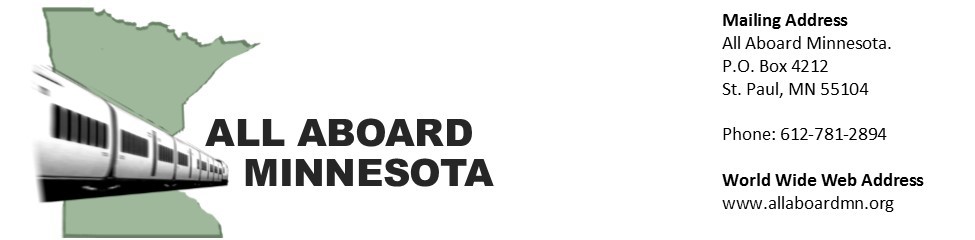 St. Paul, Minnesota (September 22, 2016 ) – All Aboard Minnesota was disappointed that a special session was not held to adequately fund transportation for Minnesotans. As state legislators reconvene in 2017 for a new session, we urge legislators to deliver a 2017 Transportation package that includes the $21 million needed by MnDot to fund rail passenger development on existing rail corridors designated in the State Rail Plan. The $21 million as proposed by bills HF 2791/SF2257 provides funding to expand intercity rail passenger service (Amtrak) on four key corridors within and connecting the state of Minnesota to the upper Midwest. These four main corridors are: