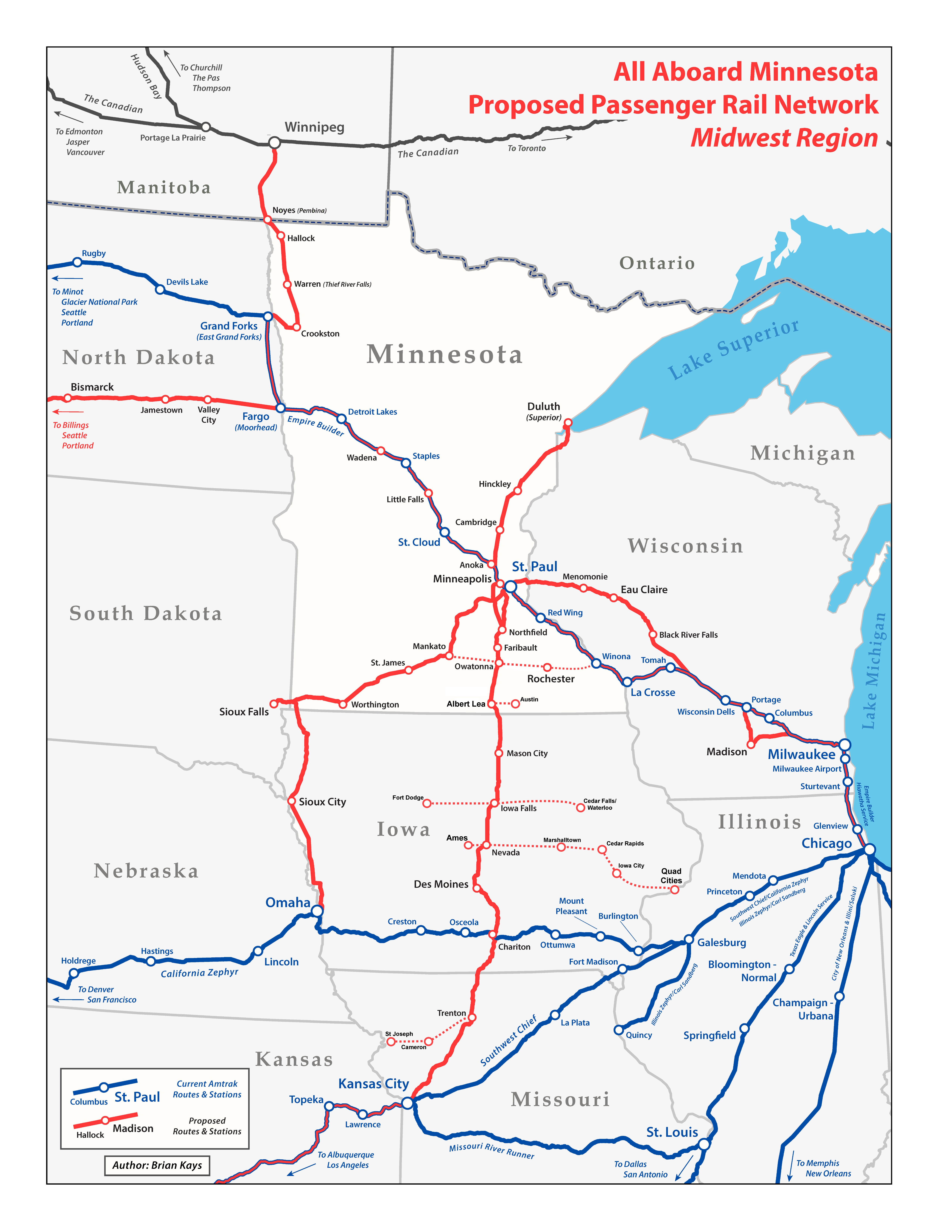 All Aboard Minnesota has studied all the potential rail routes in the state of Minnesota and surrounding region. We evaluated populations, current track conditions and speeds, past ridership and schedules, conducted surveys of Amtrak passengers and reviewed the Federal Bureau of Transportation Statistics Travel Survey data.